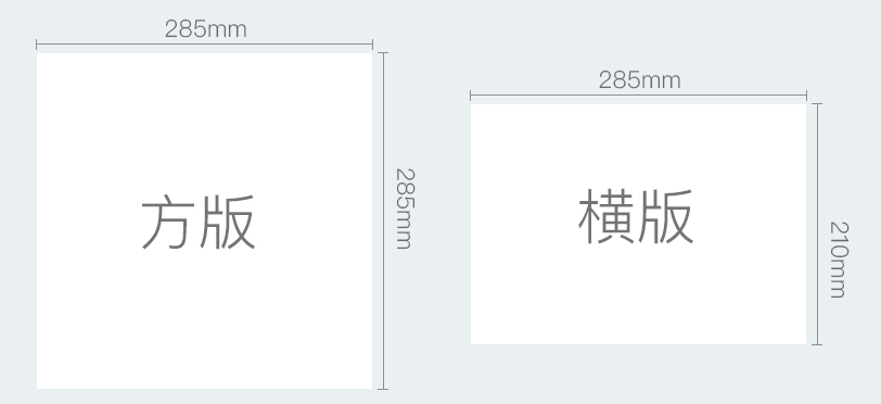 橫款與豎款的區(qū)別一般指的是長邊既285mm所在的方位,長邊為底邊則是橫款,長邊若為高,則是豎款。如果底邊與高都是285mm,則是12寸方款畫冊(cè)。同樣的道理應(yīng)用于6寸及8寸的畫冊(cè)上。6寸:100mm X 145mm;8寸: ?140mm X 195mm;